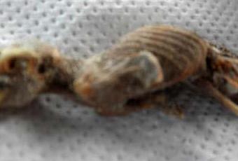 Mientras llegan los científicos, el dinosaurio petrificado (QUE ES CLARAMENTE UN MAMÍFERO, PROBABLEMENTE UNA PUÑETERA ZARIGÜEYA O MARMOSA* RECIENTEMENTE MUERTA) se conserva en una urna de vidrio.