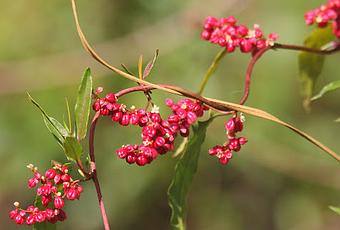 Los frutos son aquenios de color rojo o rosado a negruzcos, de hasta 4 mm de diámetro, rodeado por u perigonio carnoso.