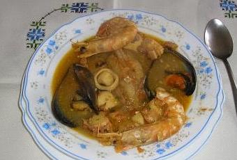 Ingredientes:4 colas de rape pequeñas8 langostinos300 gr de anillas de calamar16 mejillones2 cebollas3 tomates2 dientes de ajos1/2 litro de caldo de pescado1 vasito de vino blanco1 copita de brandy1 hoja de laurelharinaaceite de olivapimientasal