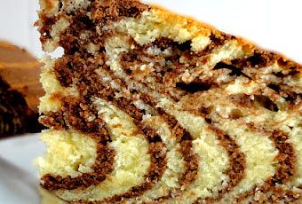 El bizcocho ya está listo. Ahora sólo hay que seguir unos pasos para que al cortarlo aparezca el dibujo tipi cebra... En un molde engrasado iremos vertiendo masa de un color y masa de otro alternándolas, en pequeñas porciones y desde el centro. De manera que echaremos un par de cucharadad de una, encima otro par de cucharadas de la otra... Y así sucesivamente hasta acabar con las dos masas. El resultado final es el típico, con aros concéntricos de un color y otro.