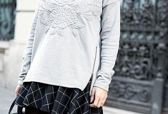 Ya me conocéis... soy muy pero que muy fan de las sudaderas grises, siempre que puedo añado un nuevo modelo a mi armario, forman parte de mis básicos por excelencia no solo por su comodidad sino también porque son muy versátiles y combinan con todo. Ésta con flores en relieve de Vero Moda x Buylevard es mi última adquisición, me encantó por los detalles de las cremalleras en los laterales con los que llevaba obsesionada desde que los vi en las propuestas otoño invierno de 3.1 Phillip Lim... ¡menos mal que existen los clones!. Os la enseño combinada con falda de neopreno de cuadros, pendientes de abalorios y botines para conseguir un efecto más sofisticado y arreglado de una prenda que de por si es casual. ¿qué os parece?