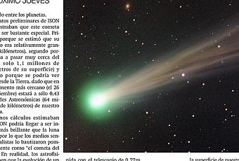 Artículo de Astronomía publicado en el Suplemento dominical El Zoco de Diario Córdoba el domingo 24 de noviembre de 2013. La imagen es una fotografía del cometa C/2012 S1 ISON obtenida el 15 de noviembre usando el telescopio de 0.77 m del Observatorio de la Hita (Toledo). Crédito de la imagen: IAA - CSIC y Fundación AstroHita.