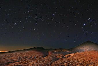 La constelación de Orión se pone hacia el oeste detrás del volcán del Teide, en Tenerife, visto desde el Observatorio de Izaña, el 19 de diciembre de 2011. Esta imagen es una combinación rápida que espero mejorar luego, donde considero por un lado una toma de las estrellas (30 segundos a 800 ISO y F5.6) y por otro una toma durante el amanecer, donde el Sol da directamente sobre el Teide y las Cañadas del Teide. Se tratan de dos tomas de la secuencia de imágenes que conseguí esa noche, mientras observaba galaxias Wolf-Rayet en el infrarrojo cercano usando el Telescopio Carlos Sánchez, para luego hacer una película timelapse del movimiento del cielo desde aquí. La imagen de las estrellas está algo desenfocada para hacer destacar el color de las estrellas. Crédito de la imagen: Á.R. L-S.