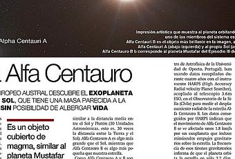 Artículo de Astronomía publicado en el Suplemento dominical El Zoco de Diario Córdoba el 28 de octubre de 2012. La imagen es una impresión artística que muestra al planeta orbitando a la estrella Alfa Centauri B, uno de los miembros del sistema estelar más cercano a la Tierra. Alfa Centauri B es el objeto más brillante en la imagen, aunque también se representa Alfa Centauri A (abajo izquierda) y al propio Sol (arriba izquierda). La imagen de Alfa Centauro B b corresponde al planeta Mustafar del Episodio III de “La Guerra de las Galaxias”. Crédito de la imagen: ESO/L. Calçada..