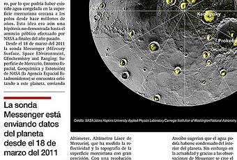 Artículo de Astronomía publicado en el Suplemento dominical El Zoco de Diario Córdoba el 13 de enero de 2013. La imagen muestra el Polo Norte de Mercurio visto por la sonda MESSENGER. En amarillo aparecen las zonas brillantes detectadas por el radiotelescopio de Arecibo en 1991. Crédito de la imagen: NASA/Johns Hopkins University Applied Physics Laboratory/Carnegie Institution of Washington/National Astronomy and Ionosphere Center, Arecibo Observatory.