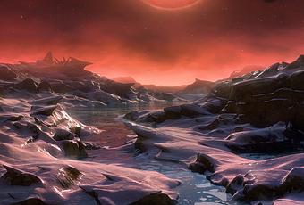 Esta ilustración muestra una vista imaginaria de la superficie de uno de los tres planetas que orbitan a una estrella enana ultrafría a tan sólo 40 años luz de la Tierra, descubierto usando el telescopio TRAPPIST, instalado en el Observatorio La Silla de ESO. Estos mundos tienen tamaños y temperaturas similares a los de Venus y la Tierra y son los mejores objetivos encontrados hasta ahora para la búsqueda de vida fuera del Sistema Solar. Son los primeros planetas descubiertos alrededor de una estrella tan pequeña y débil. En esta ilustración, uno de los planetas interiores es visto en tránsito a través del disco de su pequeña y tenue estrella. Crédito: ESO/M. Kornmesser
