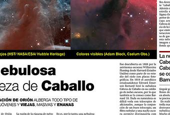 Artículo de Astronomía publicado en el Suplemento Zoco de Diario Córdoba el domingo 5 de mayo de 2013. (Izquierda) Imagen de la Nebulosa Cabeza de Caballo obtenida con el Telescopio Espacial Hubble usando filtros del infrarrojo cercano. Crédito de la imagen: NASA, ESA, and the Hubble Heritage Team (STScI/AURA). (Derecha) Imagen de la Nebulosa Cabeza de Caballo en colores del visible. Crédito: Adam Block (Caelum Observatory) Mt Lemmon Sky Center, Un. Arizona.
