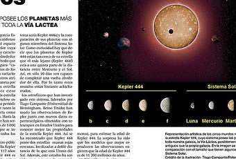 Artículo de Astronomía publicado en el suplemento el Zoco de Diario Córdoba el domingo 1 de marzo de 2015. Representación artística de los cinco mundos rocosos que orbitan a la estrella Kepler 444 y su comparación en tamaño con algunos miembros del Sistema Solar. Crédito de la ilustración: Tiago Campante/Peter Devine..