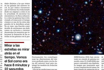 Artículo publicado en el Suplemento Dominical "El Zoco" de Diario Córdoba el domingo 1 de mayo de 2011. En esta ocasión, expliqué qué son los cúmulos de galaxias, usando como base esta historia que publiqué en Caos y Ciencia. La imagen es una composición de tomas con largo tiempo de exposición del cúmulo de galaxias CL J1449+0856, que corresponden a los débiles objetos rojizos a la derecha de la imagen. No obstante, la mayoría de galaxias que se ven en esta toma son objetos no tan lejanos. Las imágenes, en varios filtros de infrarrojo cercano, se consiguieron usando datos de los telescopios VLT (Chile, ESO) y Subaru (Hawaii, NAOJ). Crédito: ESO / NOAJ / Subaru / R. Gobat.