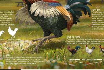 “No los mires directamente, o sospecharán”, le dice Rie a Dominic mientras circulan con su coche alquilado por entre una docena de gallos y gallinas que picotean en el aparcamiento de un lugar turístico. En un momento dado, Wright tira de una cuerda y activa el resorte de una trampa que se cierra sobre una hermosa gallina.Se encuentran en el entorno de las cataratas Opaekaa, en la isla de Kauai, un lugar donde abundan los pollos asilvestrados, emparentados con los que nos proporcionan carne y huevos en los supermercados pero también con razas más antiguas que llegaron a las islas hace varios siglos. Lo que los convierte a ojos de los biólogos en un interesante campo de estudio sobre la evolución. ¿Qué les pasa a unos seres como las gallinas, tan modificadas por el ser humano, cuando se vuelven salvajes? La domesticación transforma a estas aves dotándolas de rasgos provechosos para los humanos, como la docilidad o la puesta de una enorme cantidad de huevos. Desde luego, estos caracteres no son muy útiles -más bien lo contrario- para prosperar en ambientes naturales.Se pensaba que la “desdomesticación” simplemente revertía los cambios aparecidos durante tantos siglos de domesticación, pero este estudio está revelando que se trata de algo más complejo. Los pollos asilvestrados de Hawai están recuperando algunos rasgos de sus antepasados silvestres pero también conservan otros típicos de su historia doméstica. Lo que también se ha observado en poblaciones asilvestradas de perros, cerdos y ovejas.La historia de los pollos hawaianos comienza hace unos 1000 años, cuando los primeros polinesios arribaron al archipiélago introduciendo plantas de cultivo como taro, batata y cocoteros y animales como perros, cerdos y, por supuesto, pollos. Estos se parecían mucho más a su ancestro salvaje,Gallus gallus, que a las razas domésticas actuales. Cuando, en 1788 James Cook desembarcó en Kauai, los gallos ya se habían asilvestrado ocupando diversas zonas de la isla. Más tarde, los colonos introdujeron depredadores como la mangosta, que causó una escabechina entre las aves de casi todas las Hawái, aunque no en Kauai, isla a la que no llegó este carnívoro. A partir de los huracanes de 1982 y 1992 a las poblaciones silvestres se les unió un buen número de aves domésticas de las que hasta entonces se criaban en los patios traseros de las casas.Los investigadores han comprobado que los ejemplares que viven libres presentan características combinadas de las actuales razas domésticas y de las más primitivas, lo que sugiere un cruce que ha sido corroborado por análisis de ADN.Lo más curioso es que se están conservando tanto genes propios de la versión antigua como de las gallinas incorporadas recientemente a la población asilvestrada. Por ejemplo, las domésticas no incuban los huevos, rasgo que evidentemente es indeseable en la naturaleza. Ahora todas tienen el alelo relacionado con la incubación, que permanecía en los ejemplares antiguos. Como ejemplo de característica propia de las aves domésticas que se ha extendido por la población asilvestrada es la mayor tasa de crecimiento, el doble de lo habitual en las poblaciones que nunca han sido domesticadas.Otro hallazgo es que las aves asilvestradas tienen cerebros mayores que las domésticas, y están tratando de encontrar los genes implicados. También han visto en aquellas menos folículos ováricos, lo que sugiere una transición a la reproducción estacional, lo normal en la naturaleza.La vuelta a la vida salvaje no ha sido tan estudiada como la domesticación, y siempre se había pensado que los alelos que aparecen durante este último proceso son negativos en la naturaleza, pero se está viendo que eso no siempre es así, y se está comprobando en otras especies que han escapado de los entornos domésticos, como perros, gatos y cerdos.¿Y qué opinan los lugareños de los pollos silvestres? Pues hay de todo. Los campesinos se quejan de que son una plaga que destruye los árboles jóvenes y organizan batidas tratando de erradicarlos. Pero para la mayoría de la población la mayor de las molestias es el canto matutino, y no falta el típico merchandising en las tiendas para turistas.En fin, ¿qué es lo que hay que hacer con estos pollos? ¿Cuál es la postura de las autoridades al respecto? Se podría decir que estos animales están “semiprotegidos” en zonas de reserva, quizá por su peculiaridad de “semisalvajes”. Eso sí, si se cuela algún ejemplar en tu propiedad, nadie va a impedir que el ave acabe en la cazuela, si así lo decides. ¿Es conveniente elaborar un plan de protección? Primero habría que hacer un estudio de impacto ambiental, sugiere Even Gering, ecólogo de la Universidad de Michigan.De cualquier manera, los pollos están asilvestrados… hasta cierto punto. La mayoría medran por los aparcamientos y zonas de picnic, donde no les cuesta mucho esfuerzo conseguir comida de los turistas. Hay quien sugiere que debería prohibirse alimentarlos para forzarlos a buscarse la vida en los bosques, pero es poco probable que se pudiera conseguir. Wrigth opina que si se aislaran del contacto humano llegarían a convertirse de nuevo en unas aves totalmente salvajes, pero diferente de la original. “Sea lo que sea lo que signifique salvaje”