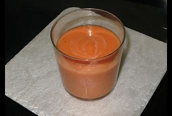 Ingredientes:- 1,5 kilo de tomates maduros.- Medio pimiento rojo.- 80 gramos de pan.- 3 zanahorias pequeñas.- 1 diente de ajo.- 20 mililitros de vinagre.- 100 mililitros de aceite.- 200 mililitros de agua.- Sal.Elaboración:Pelamos los tomates y lo echamos junto con el pimiento y el ajo (se le quita lo del centro para que no se repita) y se tritura. Luego añadimos la zanahoria y el pan cortado y se deja durante media hora para que se remoje bien y luego se tritura. Se añade el vinagre, el aceite, el agua y la sal y se guarda en la nevera hasta el momento de tomate. Se puede acompañar de huevo duro, jamón…