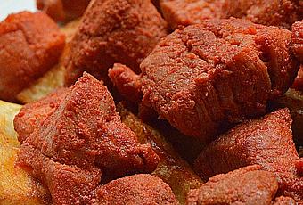 - Troceamos la carne en trozos de un bocado y la salamos, para después añadirle el pimentón dulce que le aportará color y el picante que le dará un puntito suave pero muy rico.