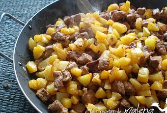Mientra hacemos la carne, pelamos las patatas, las lavamos y las cortamos en trozos de un tamaño similar a los de la carne, salamos y freímos en otra sartén con aceite abundante. Cuando estén listas -no se deben dorar demasiado- escurrimos el aceite y las echamos por encima de la carne ya cocinada, removemos y dejamos al fuego unos cinco minutos para que las patatas se mezclen con el adobo de la carne y adquieran un tono rojizo muy apetecible.