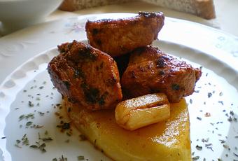 ha pasado a cortarse en trozos más grandes para luego adobarla de la misma manera, cocinarla y servirla con unas patatas fritas o como bocadillo. Ya que no puedo elaborar chorizos caseros, tarea por otro lado, en la que me gustaría enfrascarme y de la que solo tengo vagos recuerdos de mi infancia, os dejo la receta de una zorza sobre patata confitada, que quizás no sea la más ortodoxa, pero resulta deliciosa y la carne queda en su punto justo de sabor.Y antes de dejaros la receta, no me resisto a dejaros esta "perla" del cancionero popular: