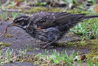Un zorzal alirrojo (busca alimento entre el musgo húmedo de un parque en Reikiavik tras una lluvia persistente. Totalmente empapado, atrapa una lombriz de tierra común (Lumbricus terrestris), que constituye una parte esencial de su dieta durante la época de cría.
